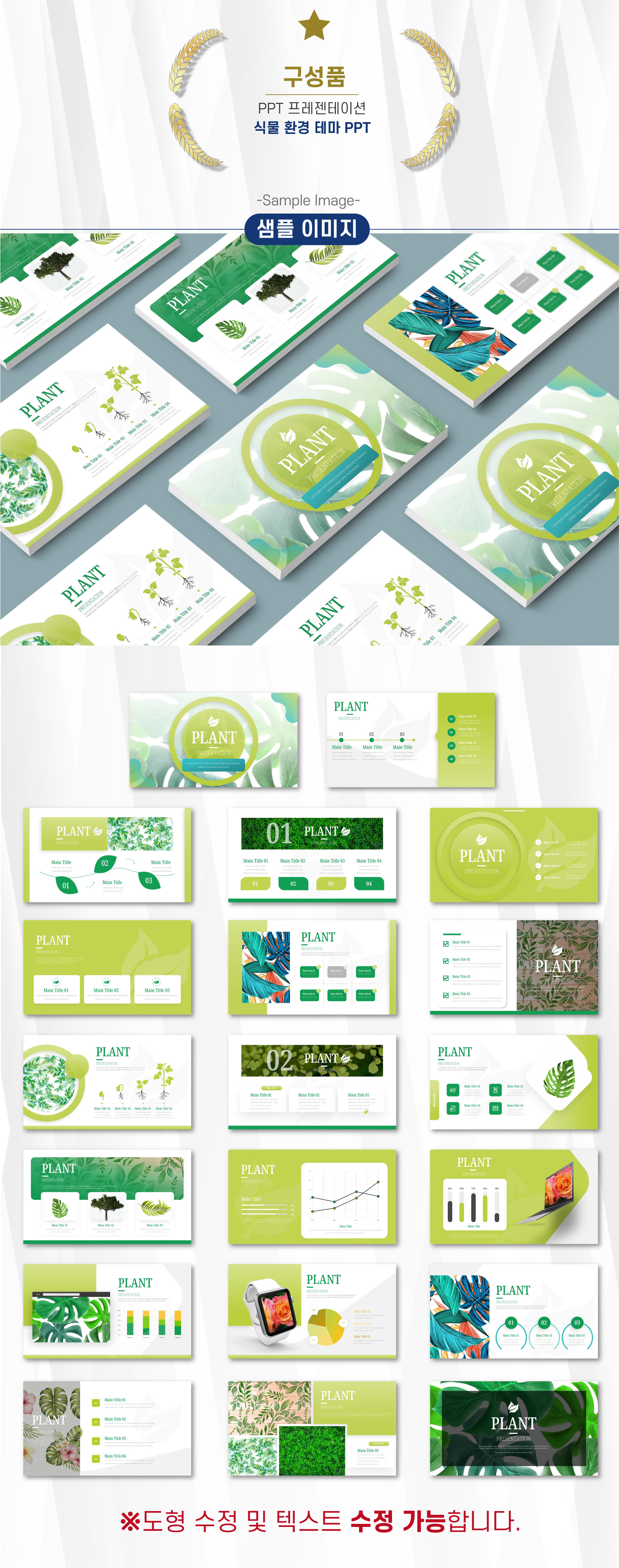 먼저 푸르른 초록색상이 눈에 띄네요. 자연의 색깔이라 그런지 보기만 해도 마음이 편해지는 색이 바로 초록색과 연두색입니다. 또한 식물컨셉에 맞게 풀 잎이나 환경 관련 아이콘 소스들이 많이 들어가있습니다. 그리고 사진들 또한 전부 나무나 풀, 잎등 자연과 관련되어 있네요. 최대한 여러 개체들을 활용하여 환경 컨셉에 맞게끔 제작하고자 했습니다. 조금 다른 느낌이나 다른 주제라면 이미지와 아이콘만 바꿔도 원하시는 느낌을 낼 수 있는 것이 이 ppt템플릿의 장점입니다. 전반적인 파워포인트 디자인을 한 번 봤으니 세세하게 좀 볼까요? 큼직한 이미지 이제부터 띄워드리겠습니다.