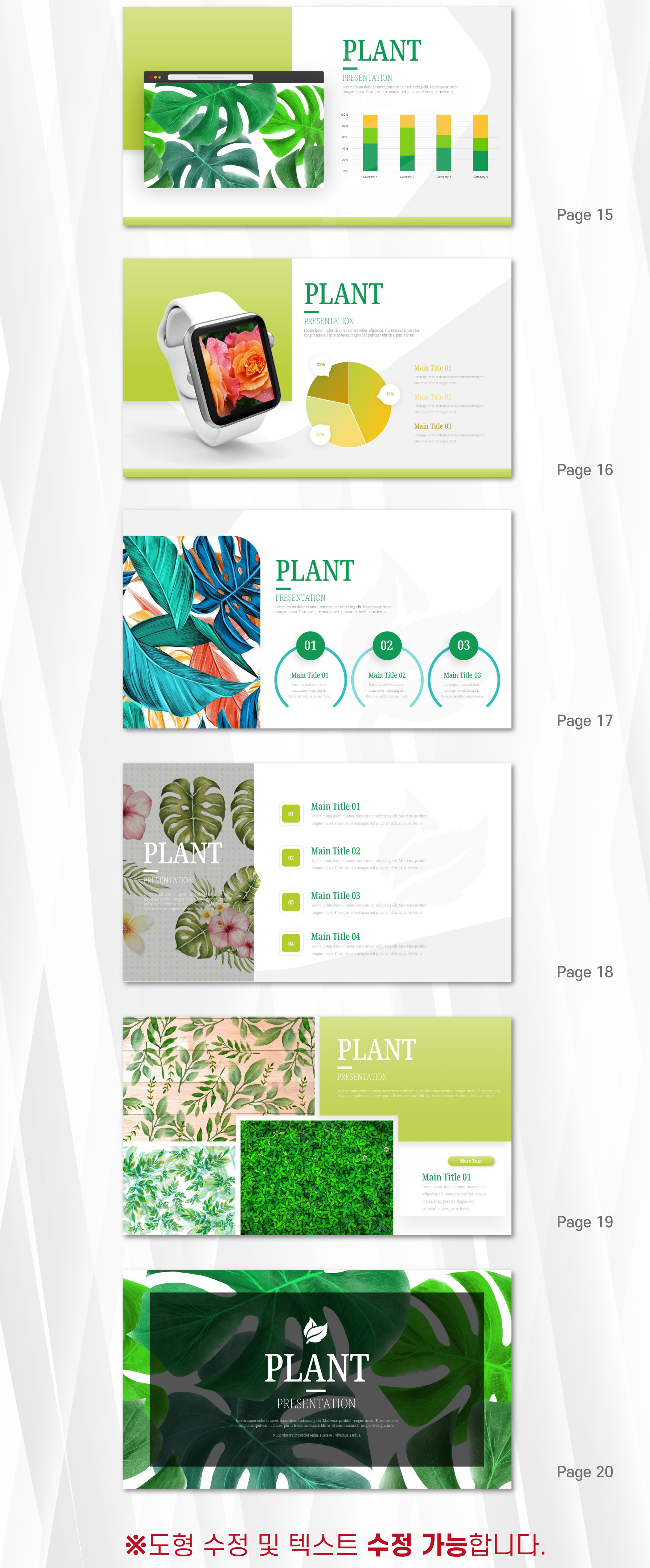 식물테마 파워포인트템플릿 15번~20번 마지막 디자인이네요. 짧게 넘어가고 있는데, 여러분들은 텍스트와 이미지 수정만 하시면 되기 때문에 아주 직관적이고 쉽게 사용가능한데요. 마지막 부분들에서는 그래프 디자인이나 선그래프, 혹은 사과워치 등 실물과 유사한 아이콘들이 삽입되어 있습니다. 식물 생애주기라던가 이산화탄소 배출비율, 환경오염에 끼치는 요소들의 데이터 내용 등 구체적인 수치 자료, 숫자와 관련된 내용들을 설명하기 좋은 디자인 페이지입니다. 적절하게 홣용해보시길 바랍니다.