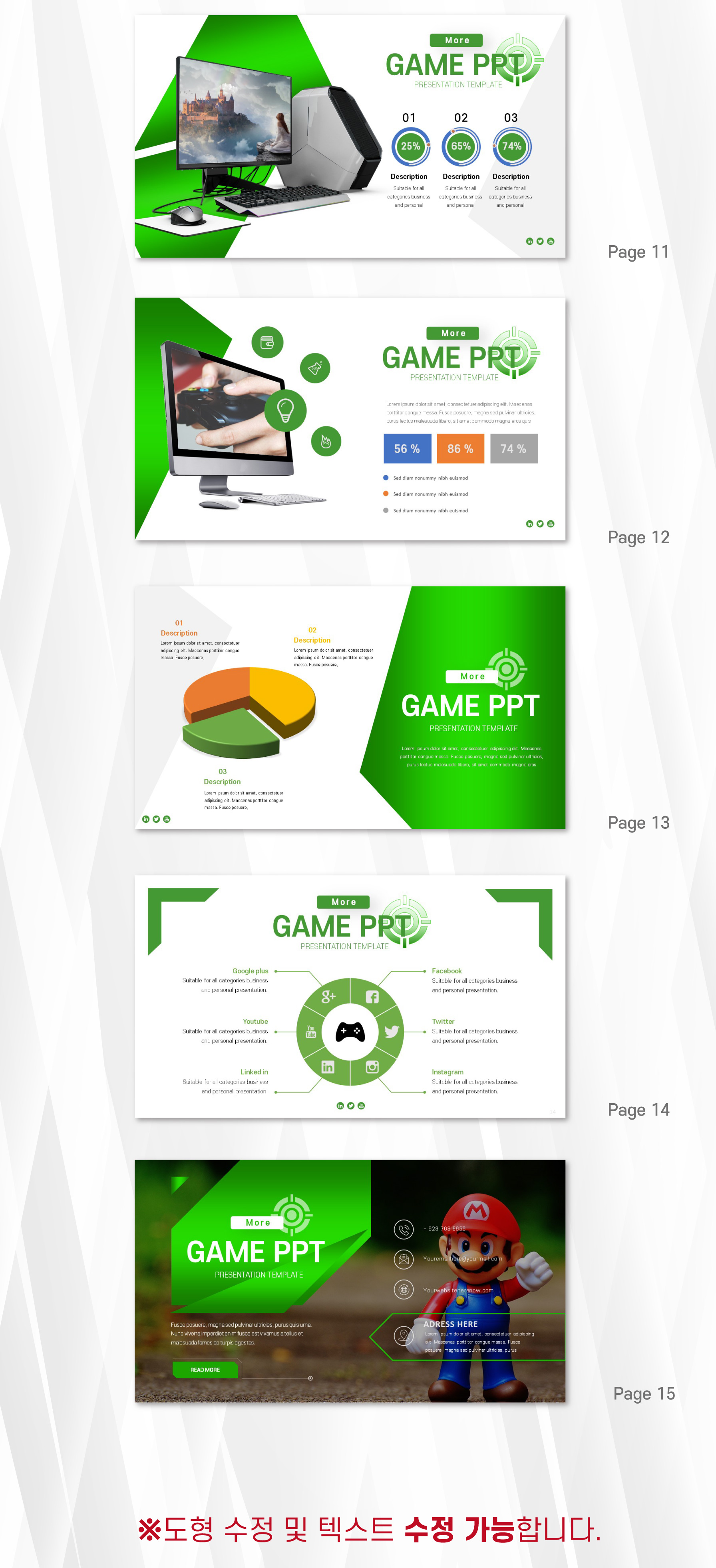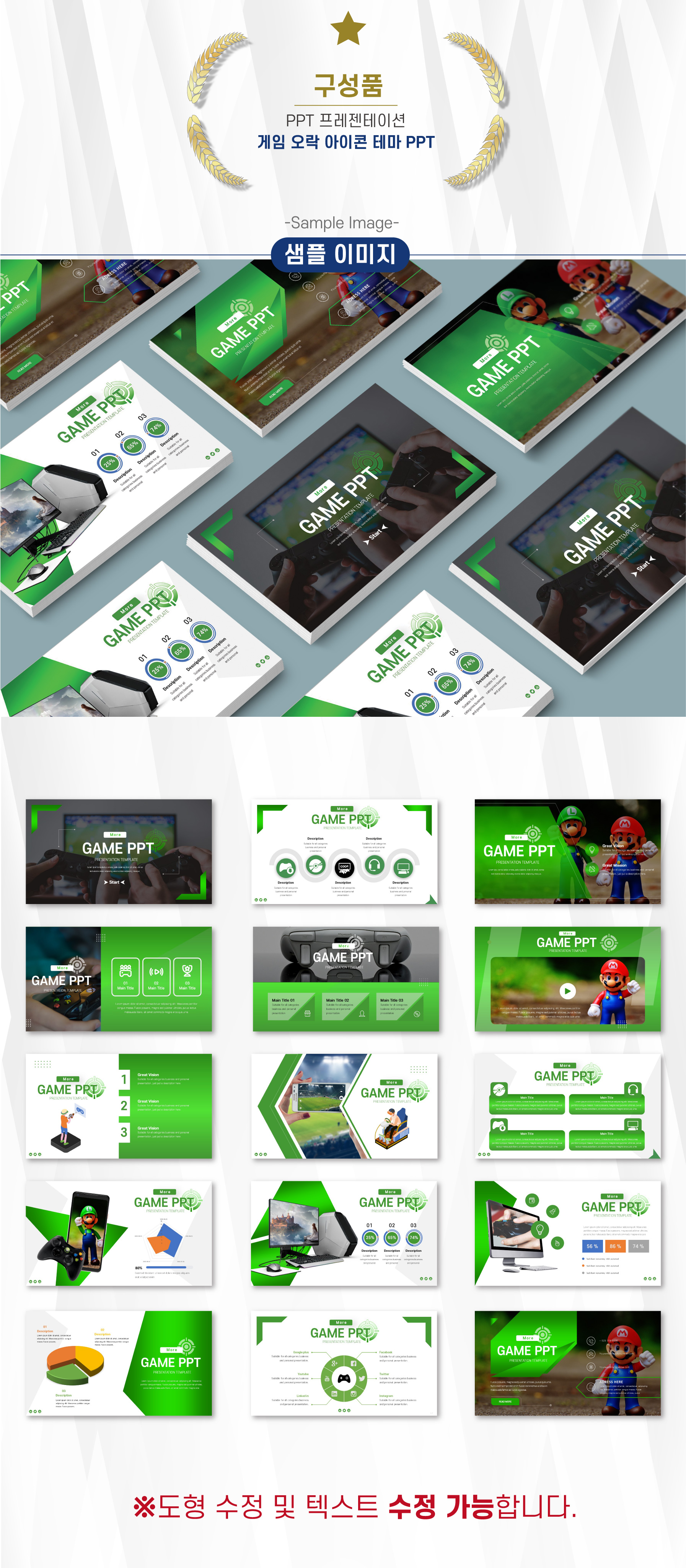 게임 및 오락테마 ppt템플릿 전체 슬라이드 이미지인데요. 초록초록한 느낌이 나죠? 이 색상을 선택한 이유는요. 딱히 게임하면 떠오르는 색깔이 없는데 그 중에서 초록색 조이스틱이 떠올랐어요. 그 부분에서 디자인을 캐치하여 전체 메인 컬러 색상 또한 초록계열 색을 사용하여 제작을 했습니다. 또한 중간중간 게임과 관련된 아이콘들을 많이 사용했으며 특히 게임과 관련한 이미지를 다양하게 구성했습니다. 모두 잘 알고 계시는 슈퍼마리오 사진을 사용했는데요. 게임과 오락의 대표 주자라고 할 수 있죠? 닌텐도부터 시작해서 pc게임까지 섭렵하고 있는 게임 캐릭터라서 한 번 사용해봤어요. 물론 저작권이 프리한 무료 이미지를 사용했습니다.